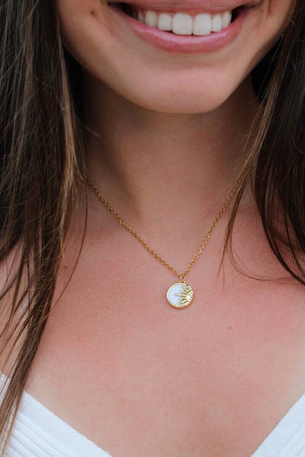 A delicate blend of warmth and elegance, this necklace features half of a sun charm paired with a pearly shell in the background. Set on a fine chain, it’s perfect for causal wear or layered looks.