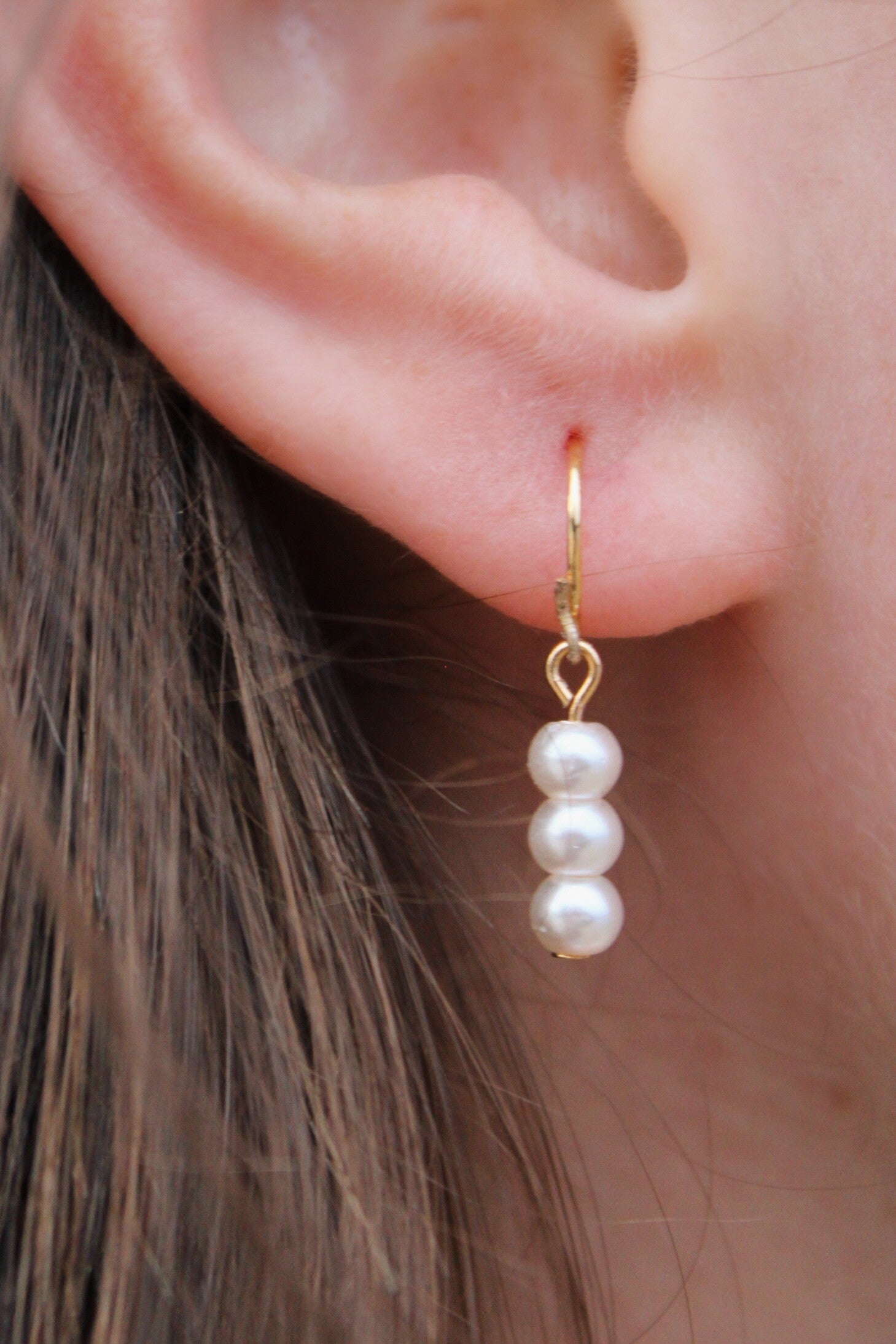 These small dangly pearl earrings are lightweight and classy. These earrings feature three 4mm pearls, adding a simple yet elegant look. They are the perfect wear for all summer long!
