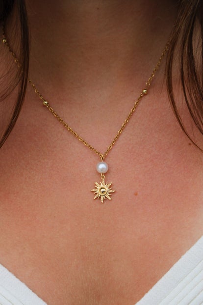 A beautiful blend of earthy and coastal vibes. This necklace features a faux pearl paired with a sun charm that measures 17.5mm X 15.5mm X 3mm. Crafted with PVD plated 18k gold. This will add a beachy vibe to any look!